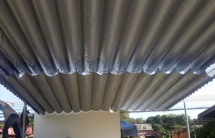 Mái xếp lượn sóng được làm từ bạt PVC chuyên dụng trong lắp đặt mái che nắng mưa, với 3 lớp mềm mại chống nóng cực tốt, cản nắng che mưa tới 99%.